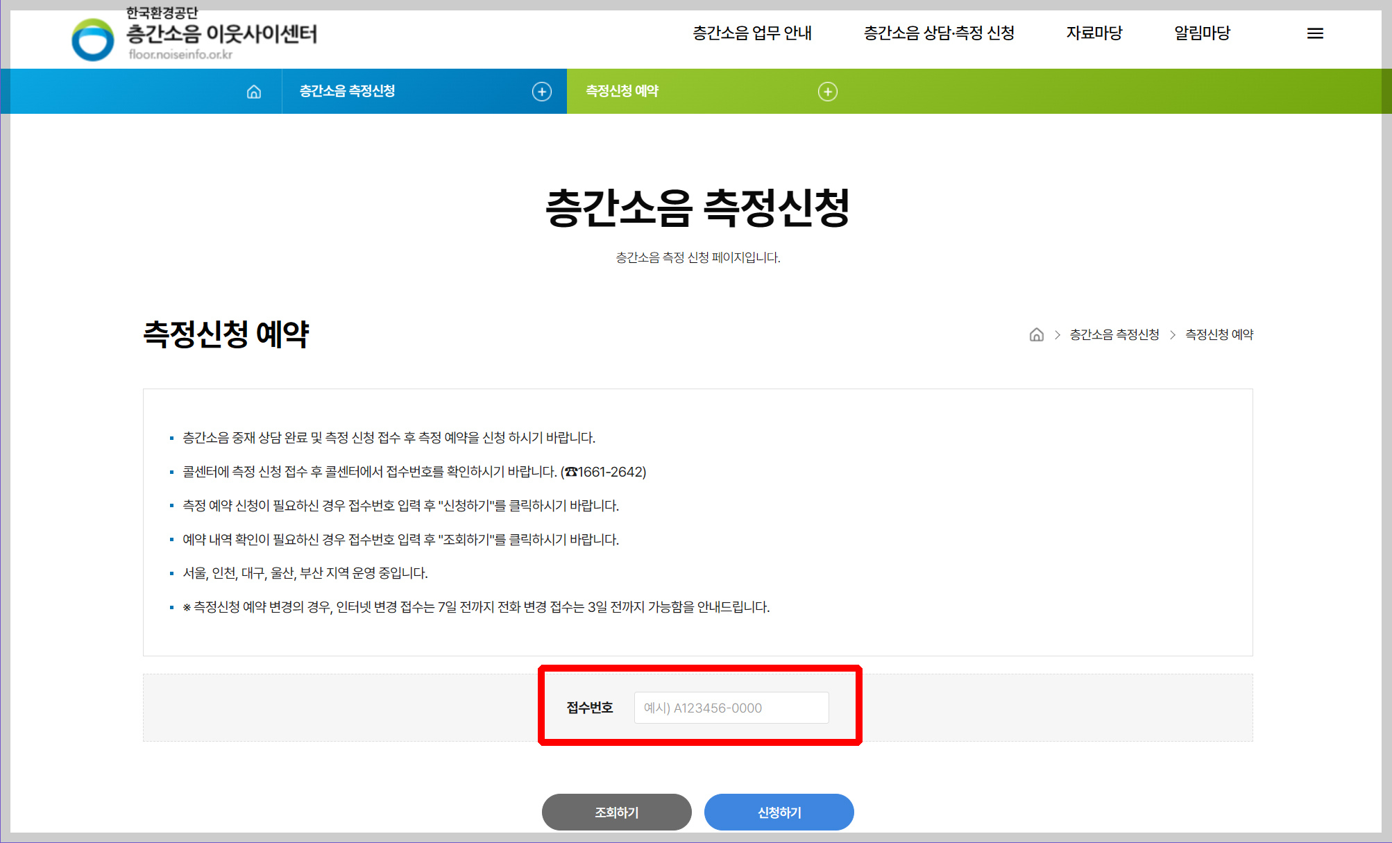 - 측정 예약 신청이 필요하신 경우 접수번호 입력 후 ‘신청하기’를 클릭