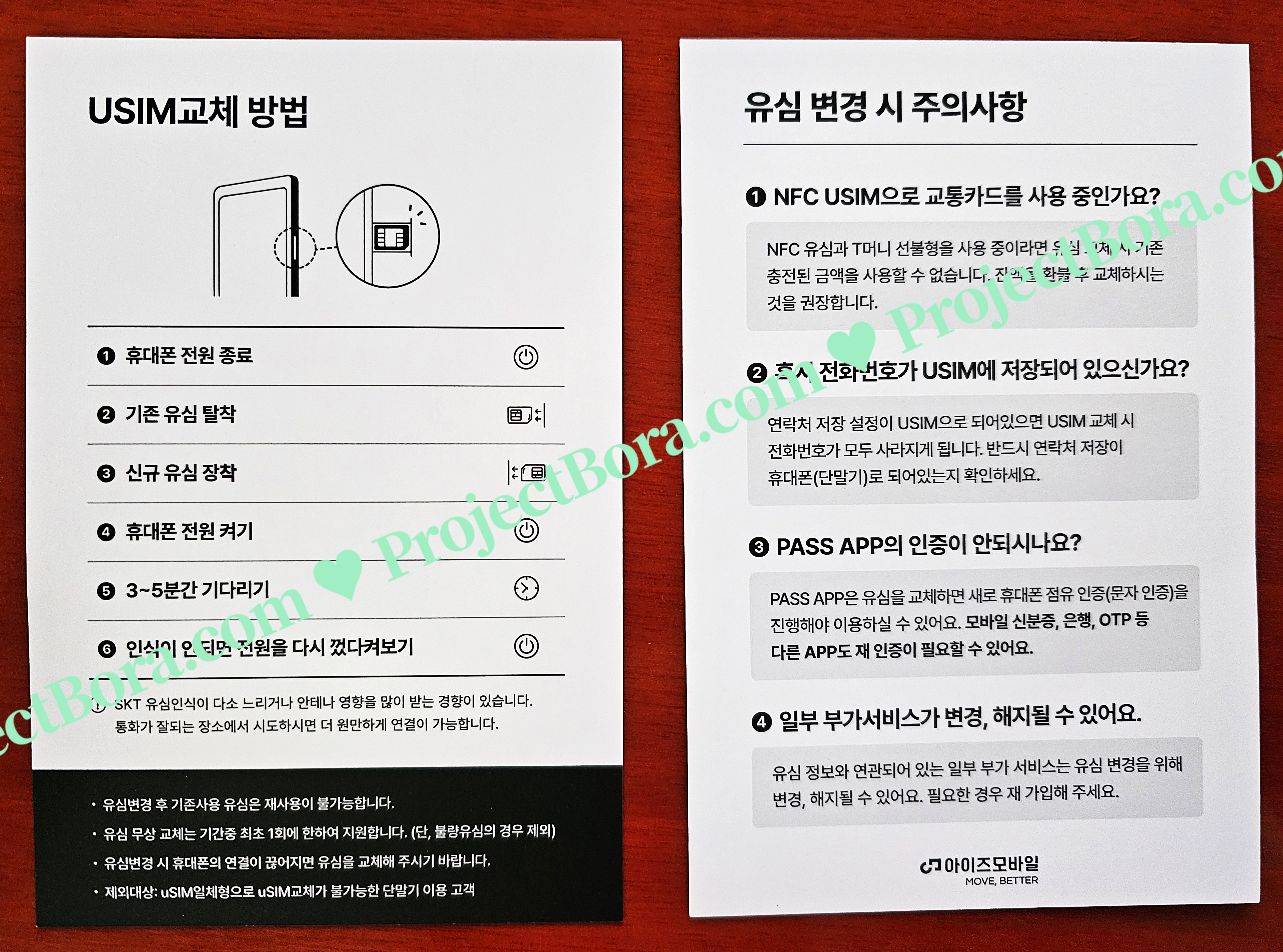 봉투를 개봉하니 유심과 교체방법·주의사항을 적은 종이가 들어있었어요.
